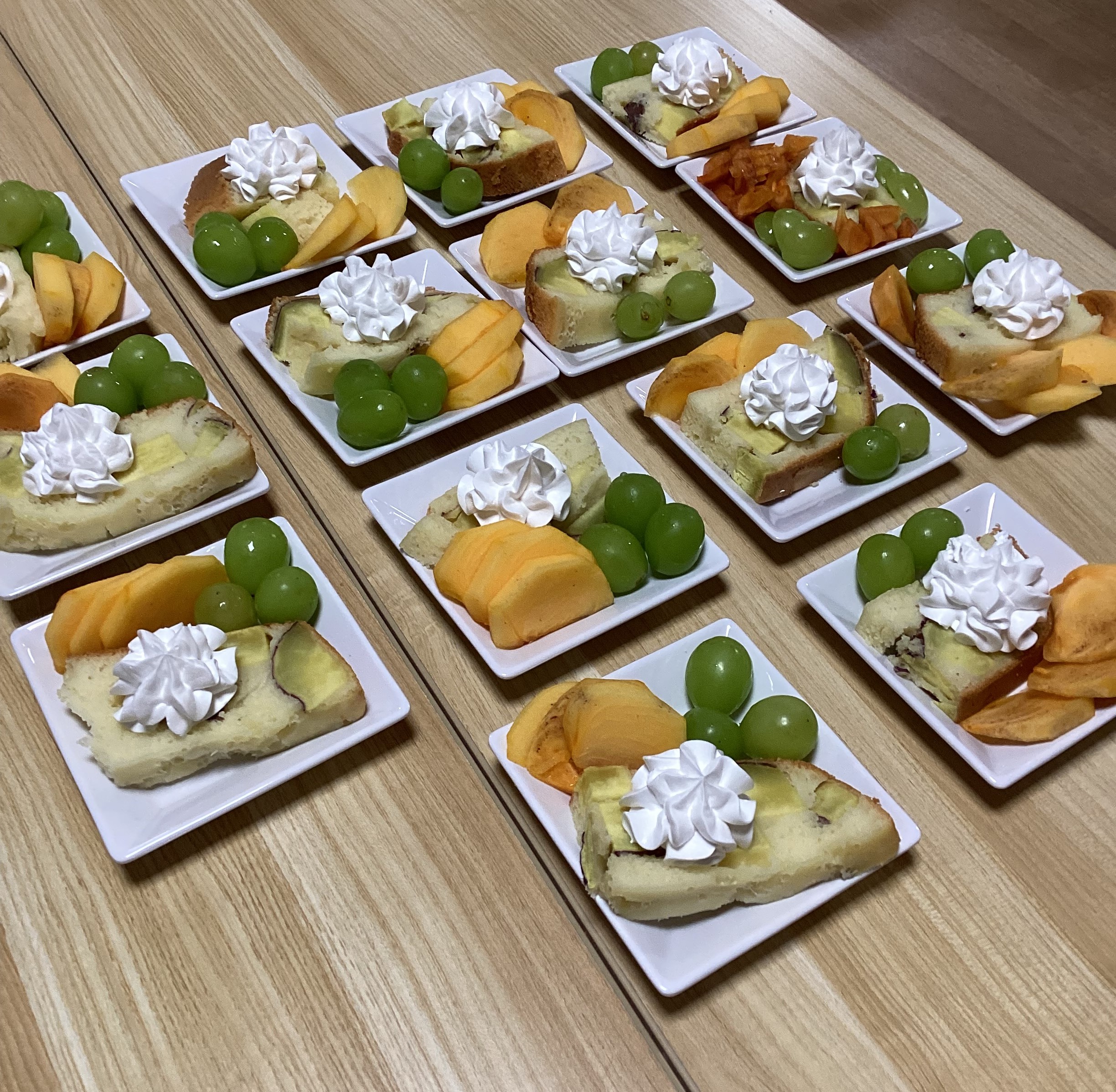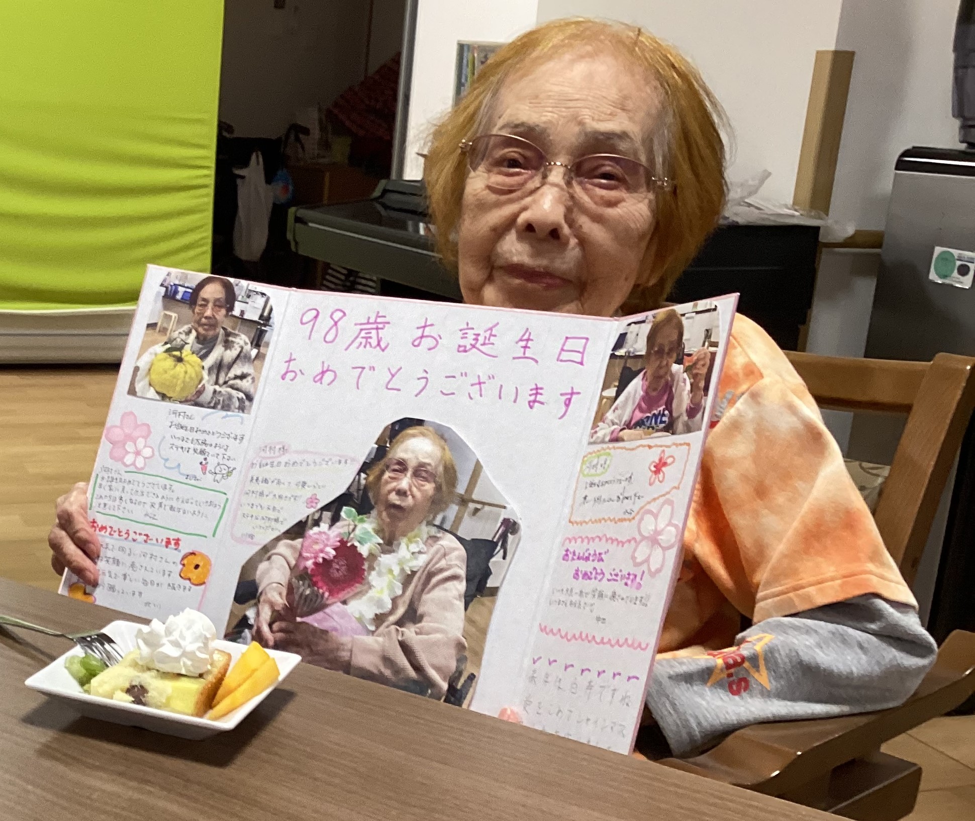 こんにちは、小規模中田です(^_-)-☆小規模では、10月の誕生日会を行いました!今回の誕生日ケーキは、さつま芋のケーキに柿とシャインマスカットを添えました。歌を歌い、誕生日をお祝いしました。とても照れていらっしゃいました。こちらは、小規模の長老様!いつも笑顔に癒されています。お二人ともいつまでもお元気で!!